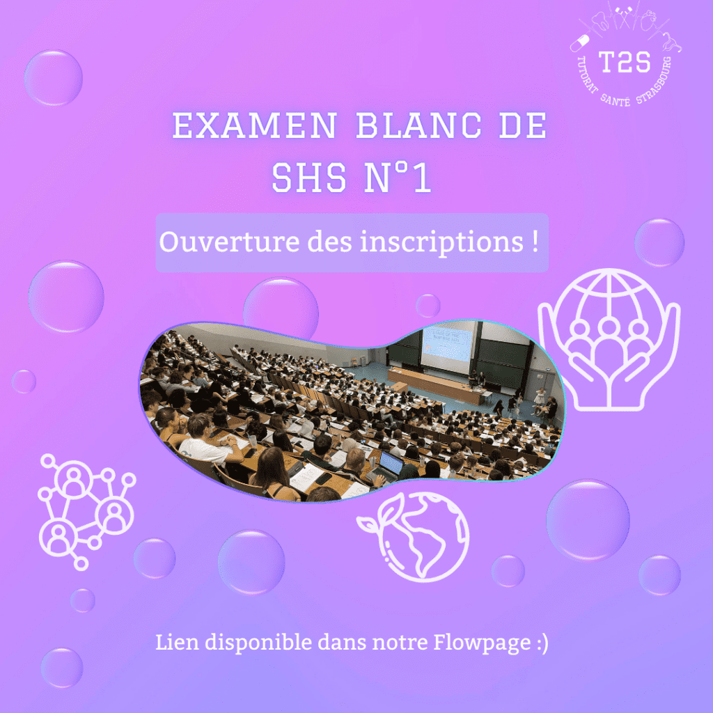 C’est pourquoi le T2S vous propose un Examen Blanc de SHS, entièrement préparé par les tuteur.ices d’UET et soigneusement relu, corrigé et approuvé par les enseignant.e.s de la faculté. Les questions concerneront tous les chapitres de SHS abordés depuis le début de l’année et qui tomberont le jour du CC1. 📚