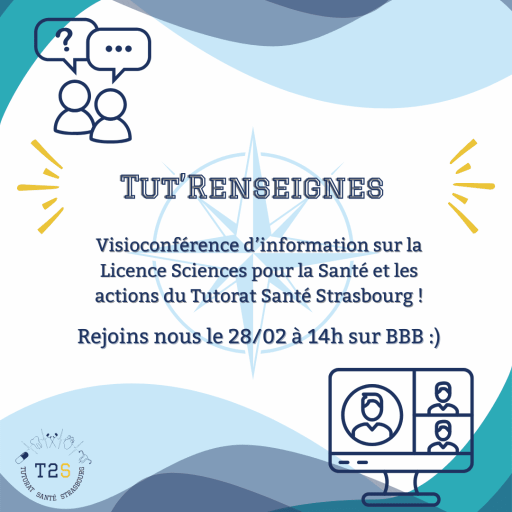 Le Tut’renseignes est une conférence en ligne, destinée aux étudiant.e.s intéressé.e.s, de près ou de loin, par les études de santé à Strasbourg. Cette visioconférence a pour but de t’éclairer sur le fonctionnement de la Licence Sciences pour la Santé (LSpS), le processus de sélection dans les différentes filières de santé et les ressources mises à ta disposition ! 💻