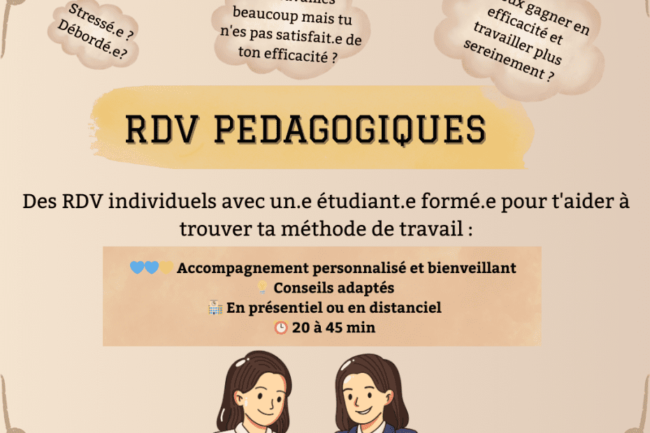 Tu es en LSPS et tu galères dans tes révisions ? Les RDV pédagogiques individuels sont faits pour toi ! Qu’est ce que les RDV pédagogiques ? Des rendez-vous personnalisés avec un.e étudiant.e formé.e pour : Faire le point sur ta méthode de travail actuelle Identifier tes difficultés et tes points forts Construire une méthode de travail qui te soit adaptée T’aider à mieux t’organiser et gérer ton temps Comment… Lire la suite »RDV Pédagogiques